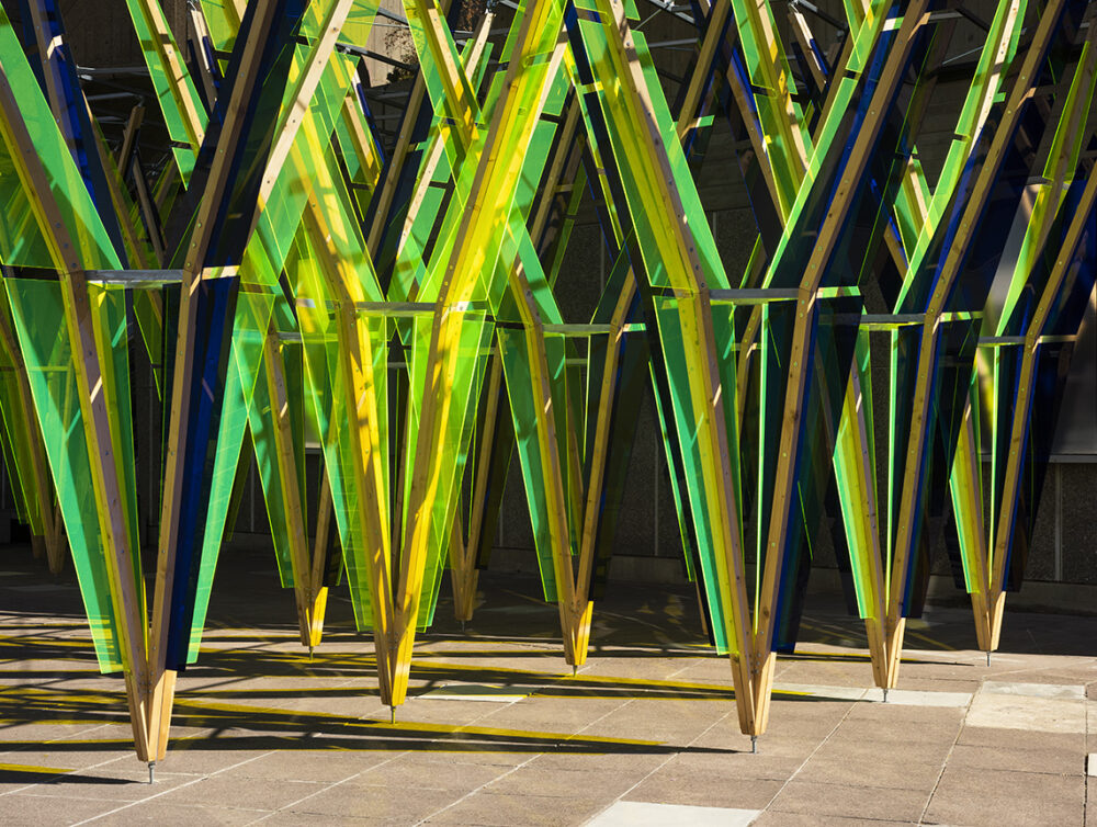 Permanent artwork pergola with seating