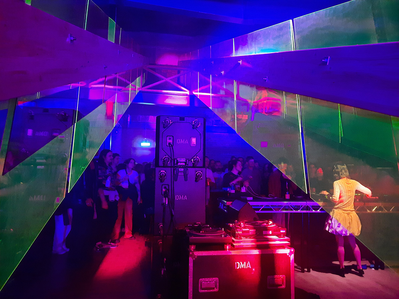 Pardes is both a sculpture and a place. It is my first for a dark light space, here, a restored former fruit warehouse. Pardes is the ancient name for an orchard or walled garden and has evolved from my research into the growing cultures and landscapes of Scotland – the ‘leaning’, geometric nature of growth and planting expressed through the slopes of the Clydesdale Valley and Newburgh where orchard culture flourished, as well as historic glasshouses. From this I have grafted an abstract, minimalist work pared back in lockdown to its core essentials, mirroring my own questions during this time of ‘what really matters.’ Pardes flies through the warehouse from ceiling to floor, its live-edge Plexiglas gathering available light and pushing it to the edges to make a gloaming work, literally and metaphorically holding the space. Echoing the ancient uses of gardens, Pardes transforms from a place for contemplation to one of gathering and others creation. Over its life the work will host riotous club nights, new performance art, film screenings and more. I am interested in the generative nature of minimalism, paring something back can open up conversation and meaning.